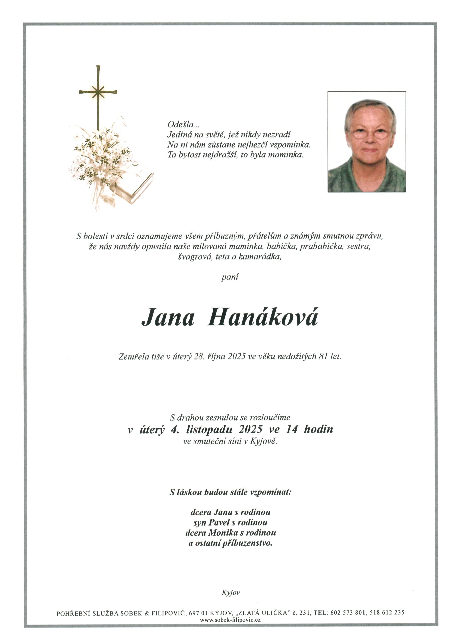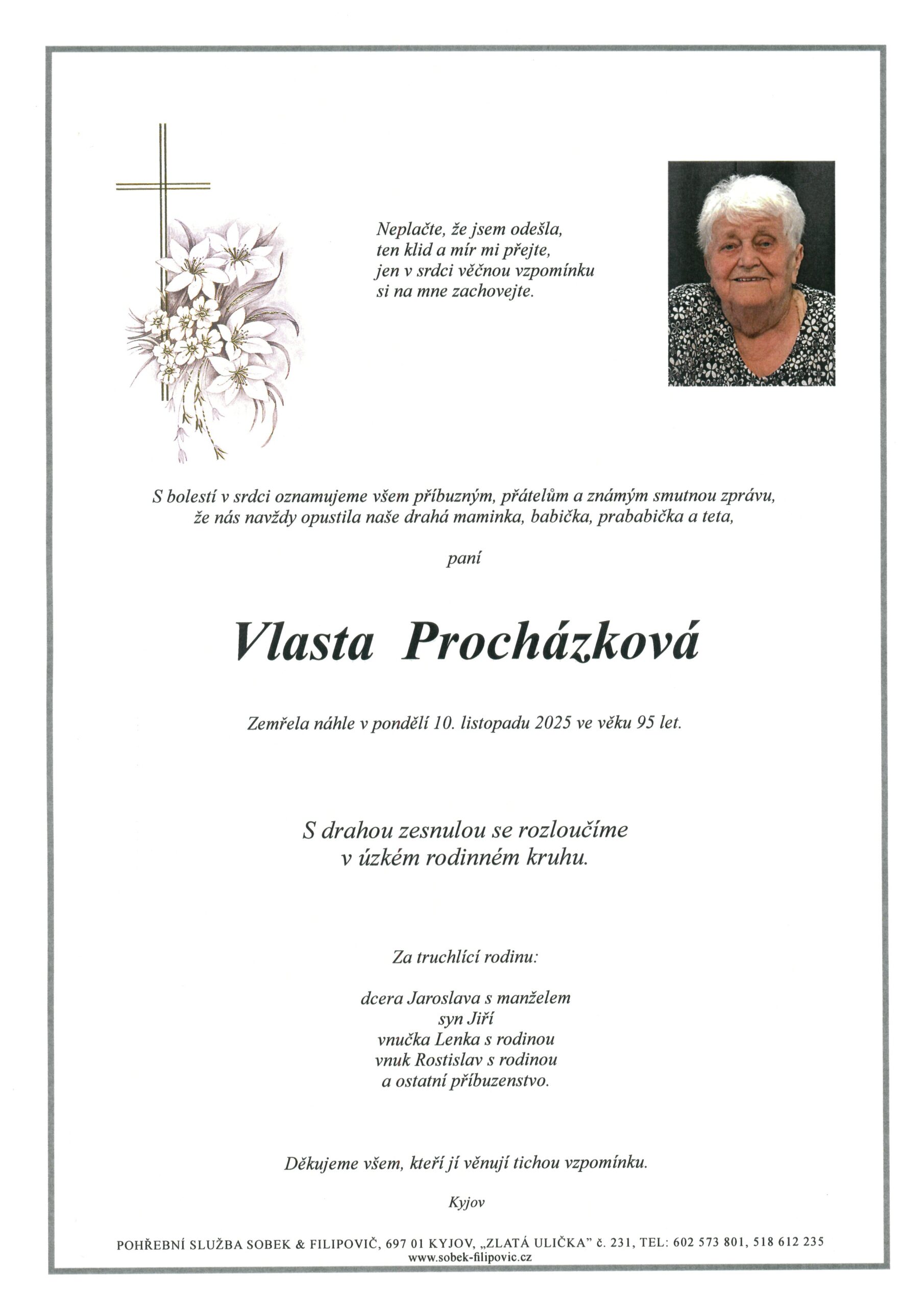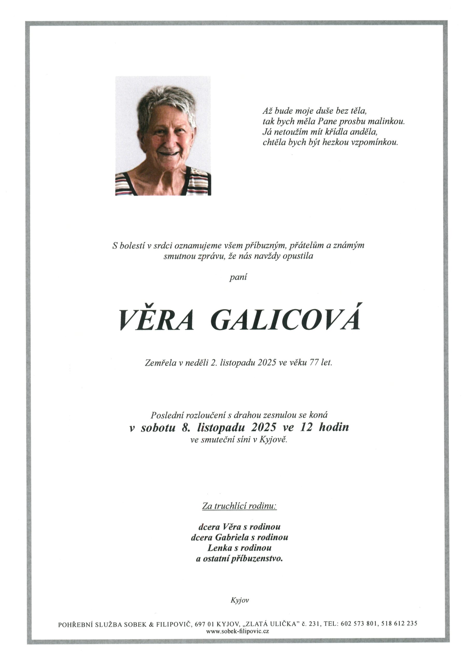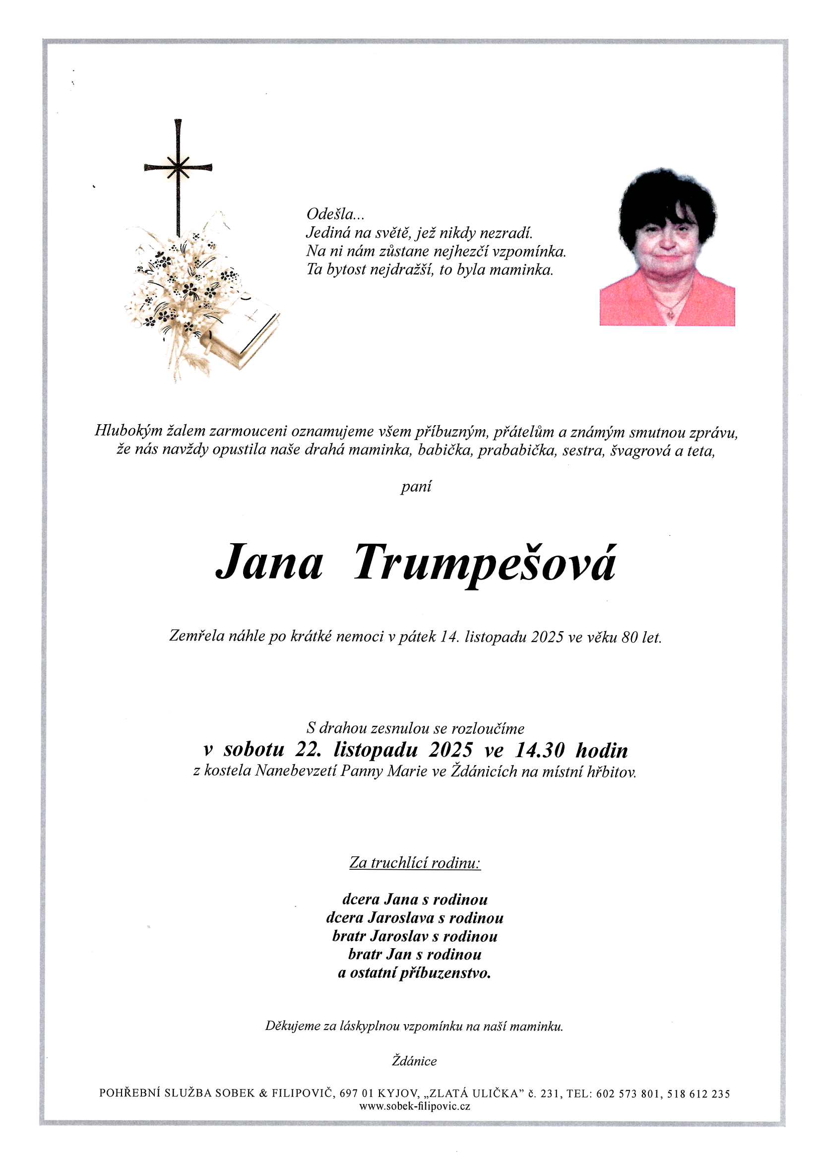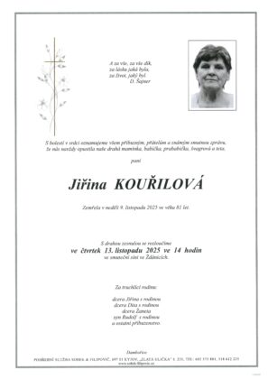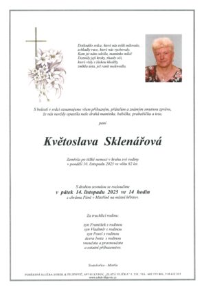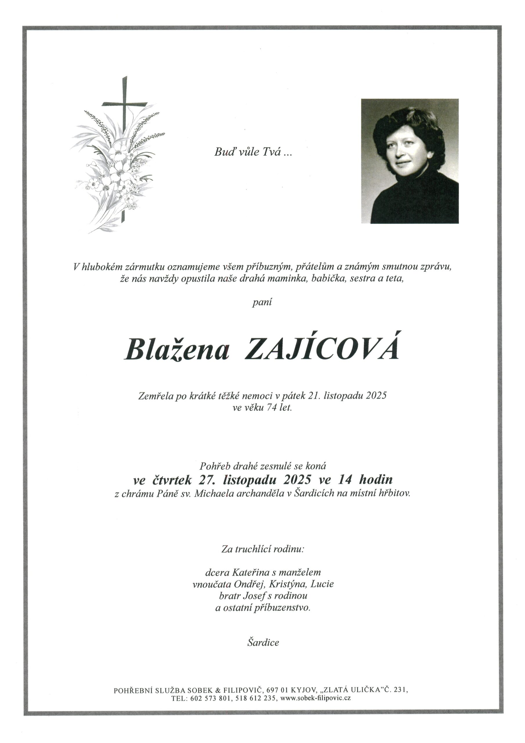 | Blažena Zajícová | 1951 | 27. 11. 2025, 14:00 | Šardice |