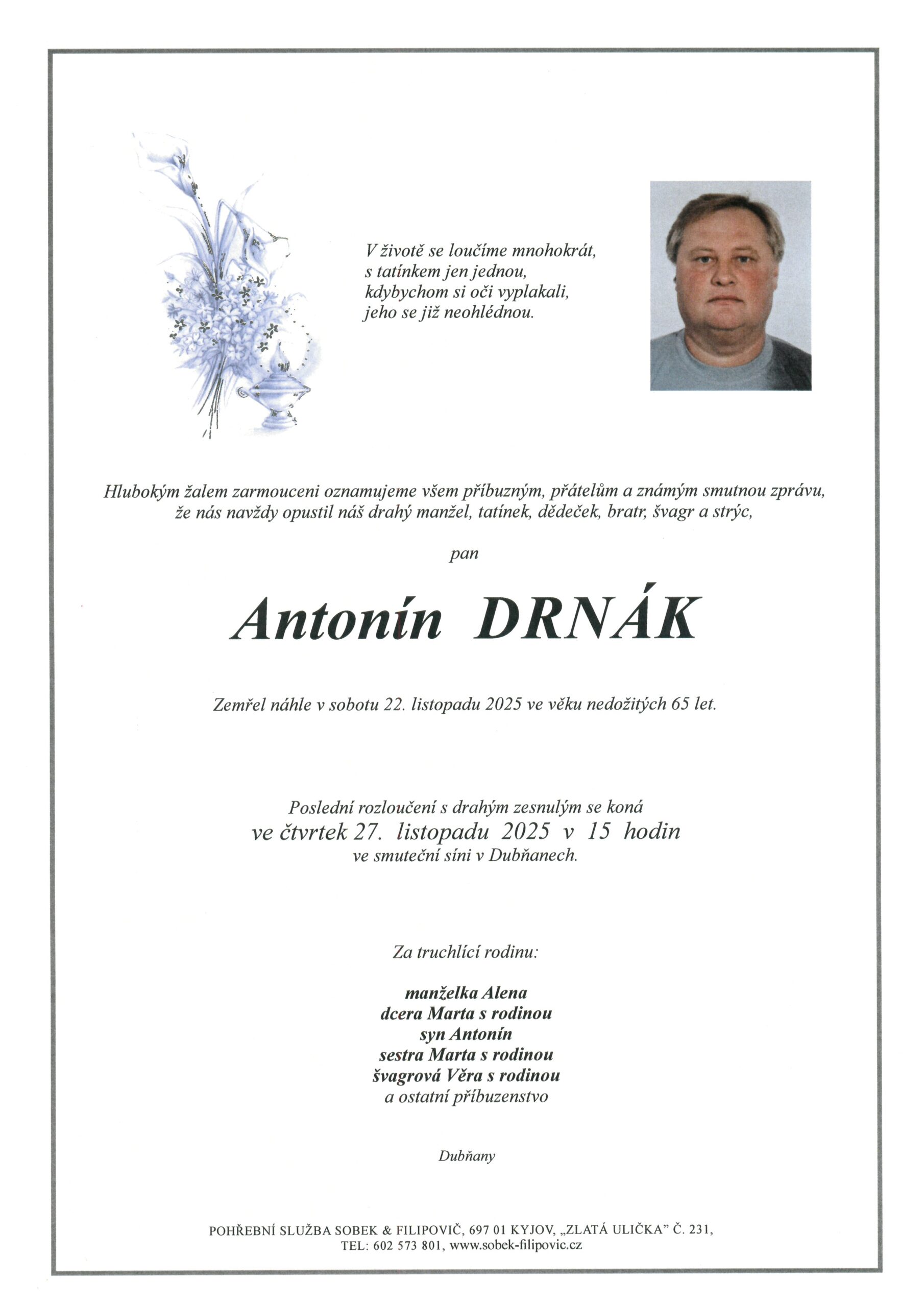 | Antonín Drnák | 1961 | 27. 11. 2025, 15:00 | SS Dubňany |