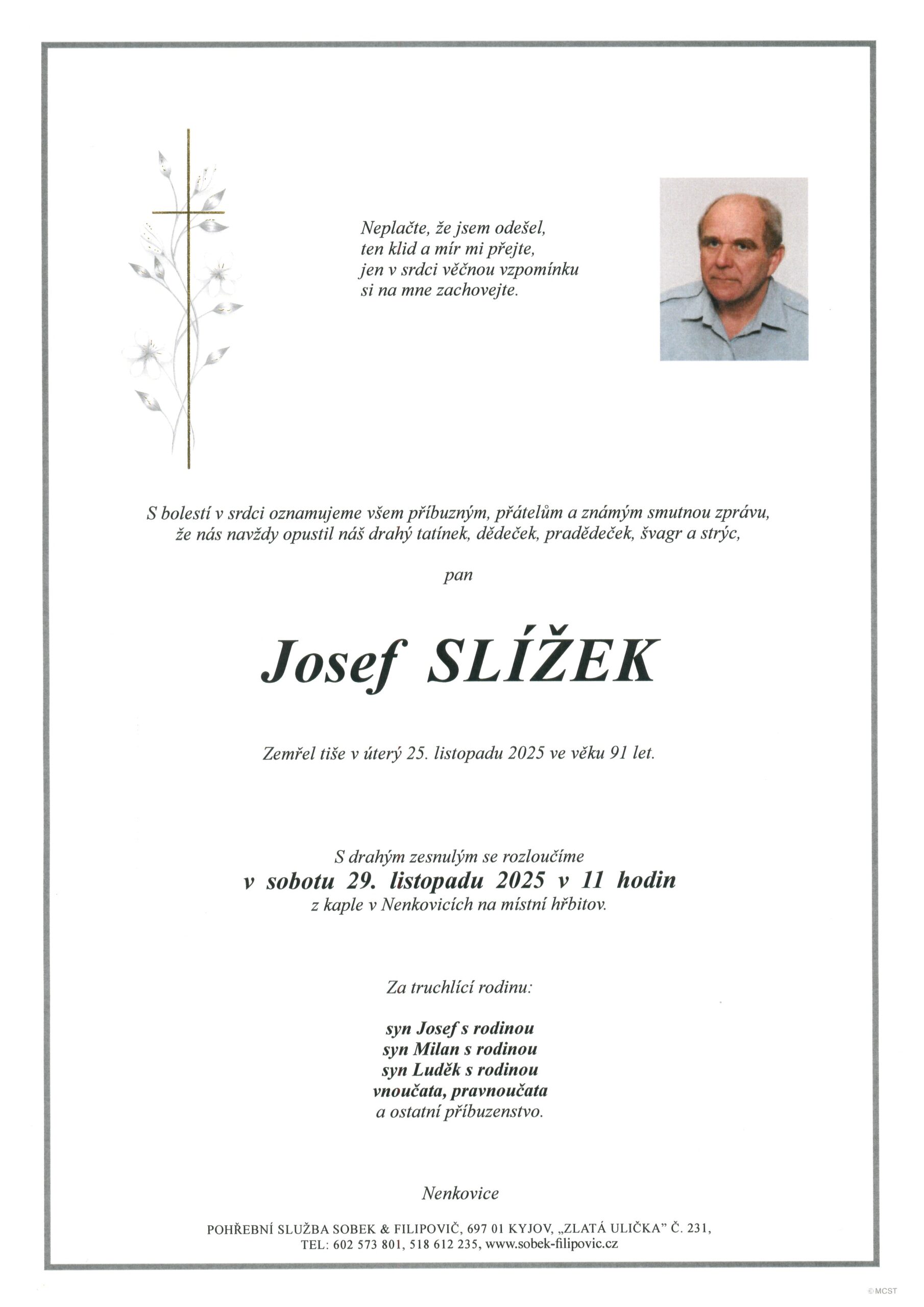 | Josef Slížek | 1934 | 29. 11. 2025, 11:00 | Nenkovice |