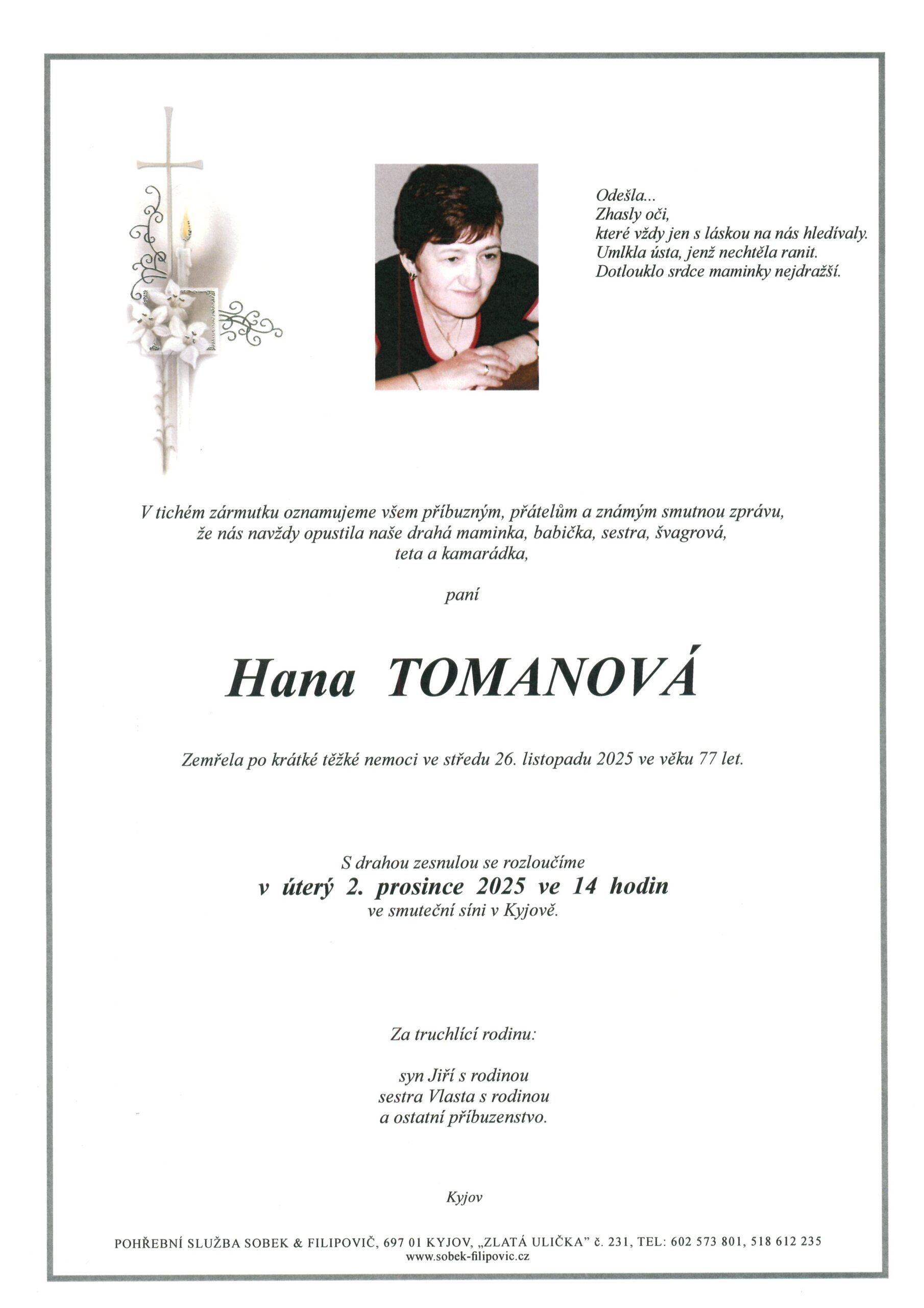 | Hana Tomanová | 1948 | 2. 12. 2025, 14:00 | SS Kyjov |