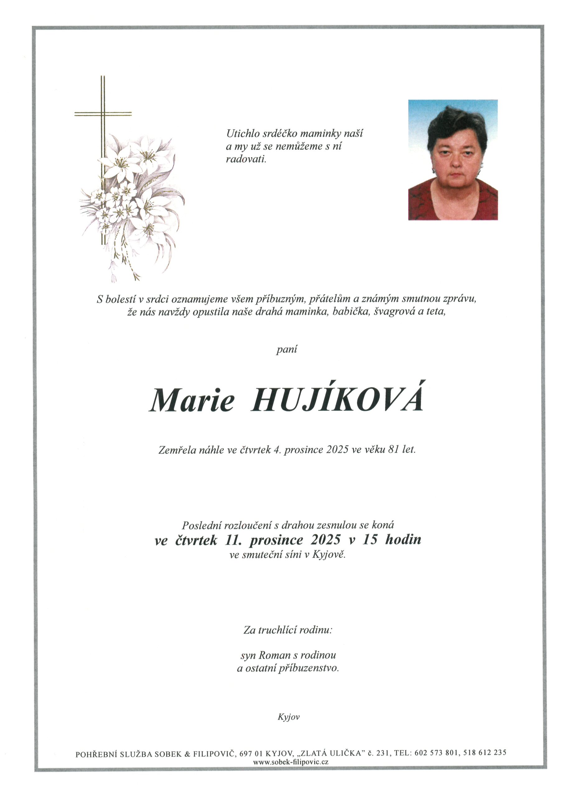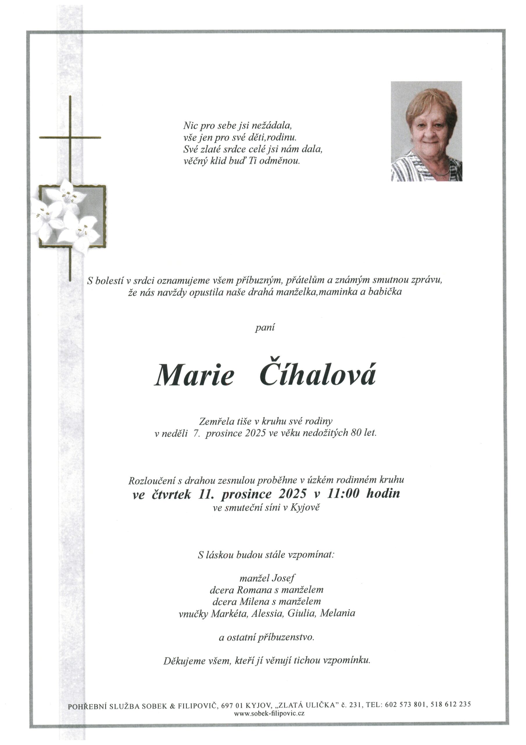 | Marie Číhalová | 1946 | 11. 12. 2025 11:00 | SS Kyjov |