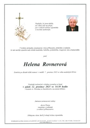 | Helena Rovnerová | 1936 | 12. 12. 2025 14:30 | Stavěšice |