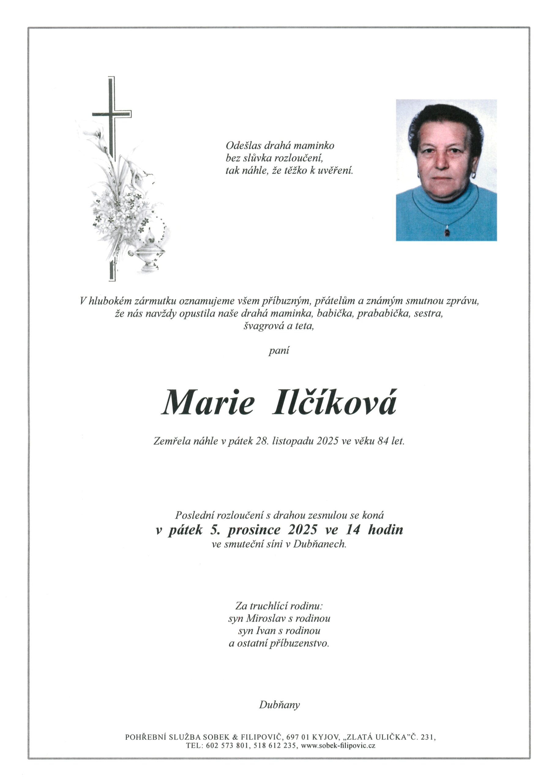 | Marie Ilčíková | 1941 | 5. 12. 2025, 14:00 | SS Dubňany |