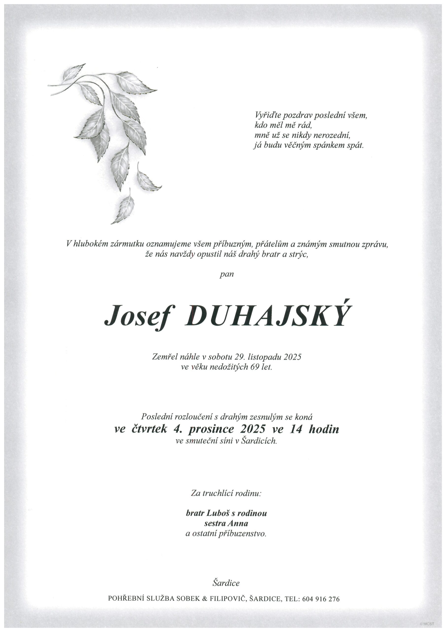 | Josef Duhajský | 1957 | 4. 12. 2025, 14:00 | SS Šardice |