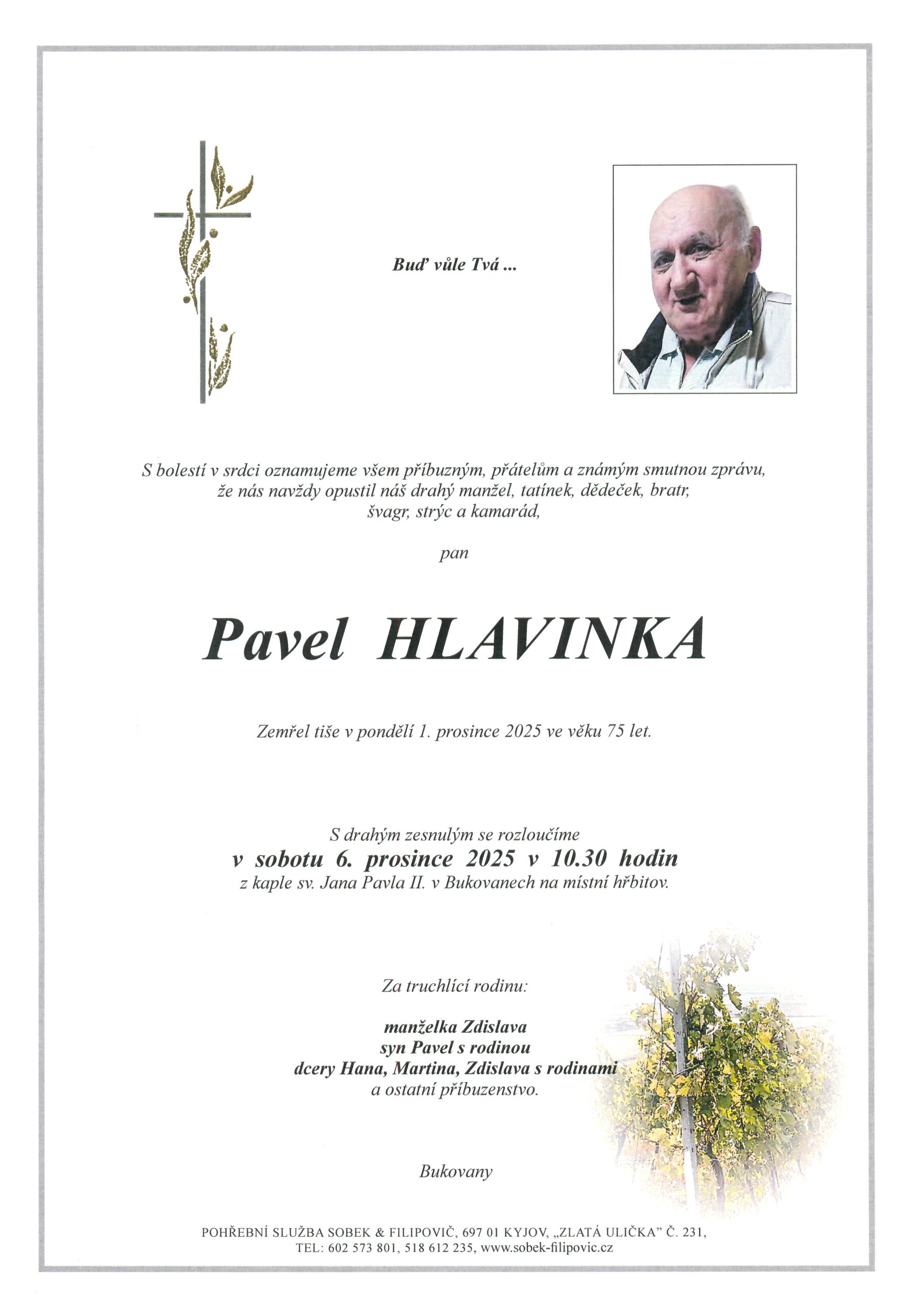| Pavel Hlavinka | 1950 | 6. 12. 2025, 10:30 | Bukovany |