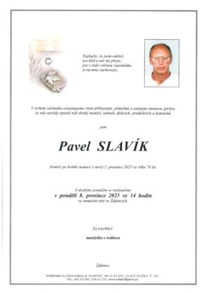 | Pavel Slavík | 1947 | 8. 12. 2025, 14:00 | SS Ždánice |