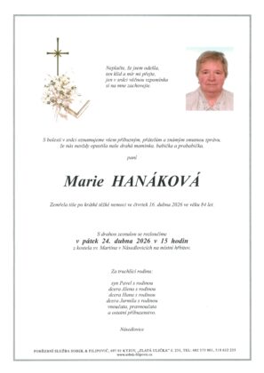 | Marie Hanáková | 1942 | 24. 4. 2026, 14:00 | Násedlovice |