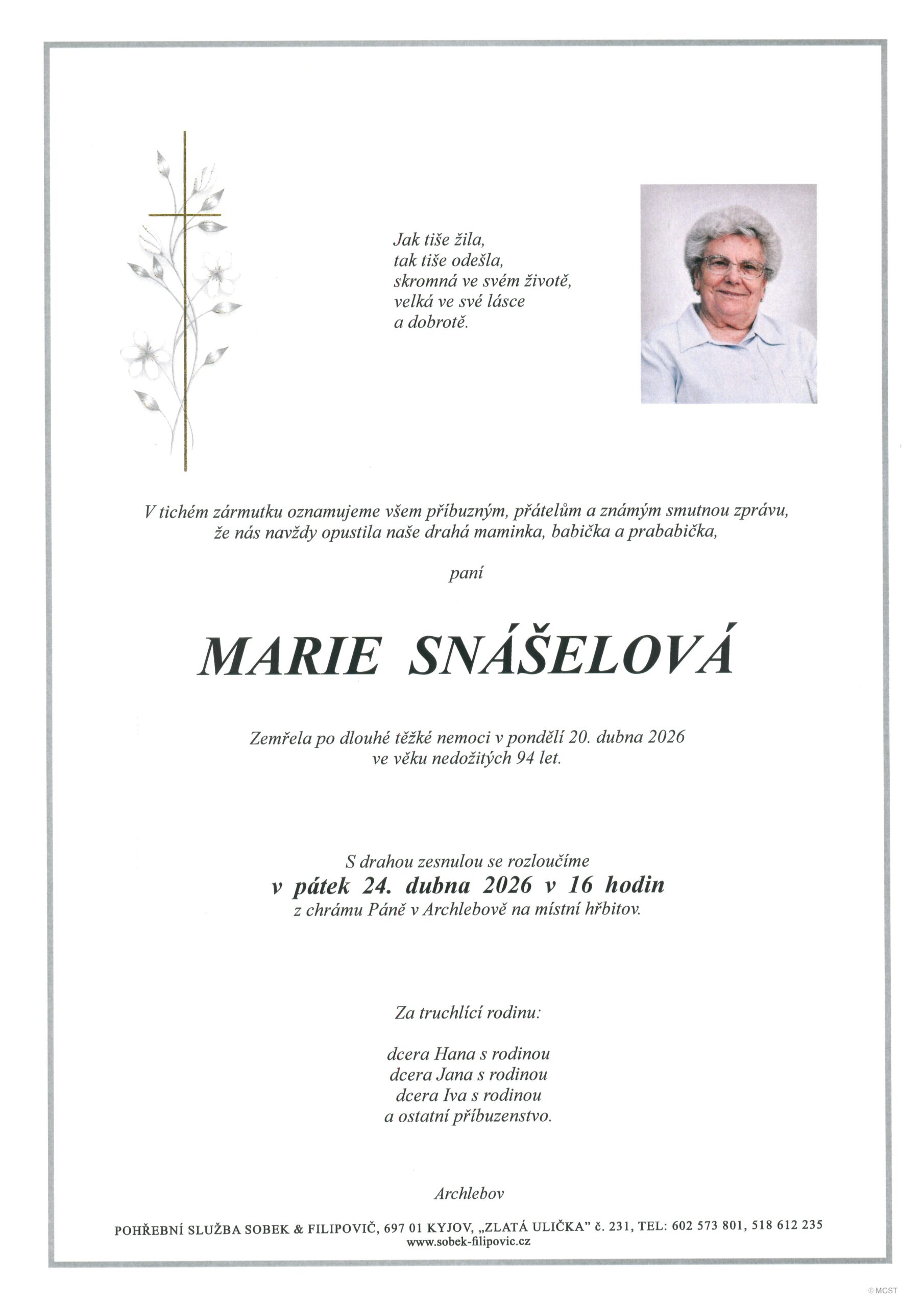 | Marie Snášelová | 1932 | 24. 4. 2026, 16:00 | Archlebov |